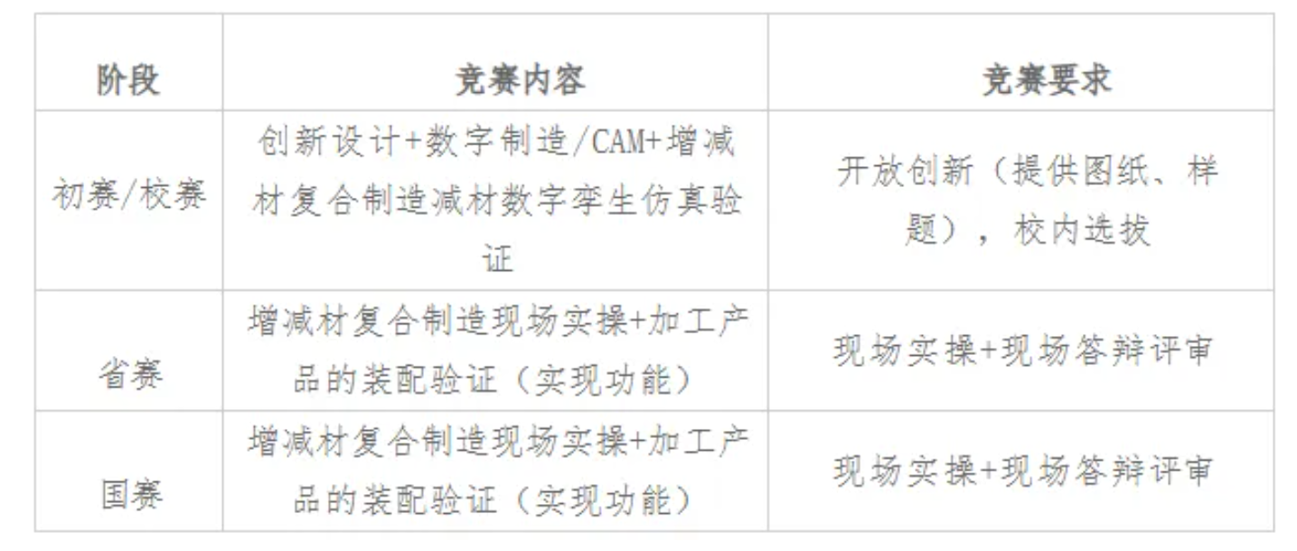 “数马&华教杯”增减材复合制造及数字孪生技术创新应用大赛涵盖数字化创新设计、CAM/数智制造、增材制造和桌面式五轴加工数字孪生技术、增材制造设备和桌面式五轴加工中心设备现场实操、产品功能实现等五个环节中的实际工程问题,重点考察学生对基础学科及专业学科理论知识的理解与项目案例的实践创新应用,掌握数智化技术的实际应用及解决实际工程问题的综合实践能力,培养大学生系统性思维,鼓励学科知识交叉融合,鼓励创新、创造精神与数智工匠精神。赛项为校赛、省赛和国赛三个赛段开展。校赛为线上竞赛/校内选拔,参赛选手统一在该赛项3Dshow专辑官网(https://3dshow.3ddl.net/i/WZ-HJZC)按要求完整、准确、真实地填报相关信息,并提交作品,提交成功后即为初赛/校赛报名成功。省赛、国赛为线下赛,入围的选手需到竞赛现场参赛。